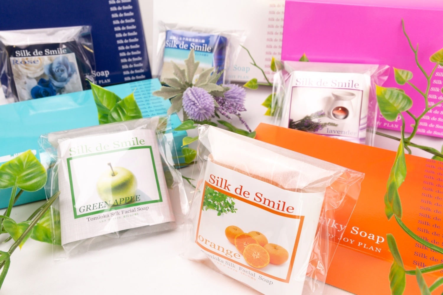 ●群馬県前橋市『関東工業開発 JOY PLAN』富岡シルク「蒟蒻洗顔シルク石鹸」シルク デ スマイル 青リンゴの香り/みかんの香り(1個/100g)各1,650円