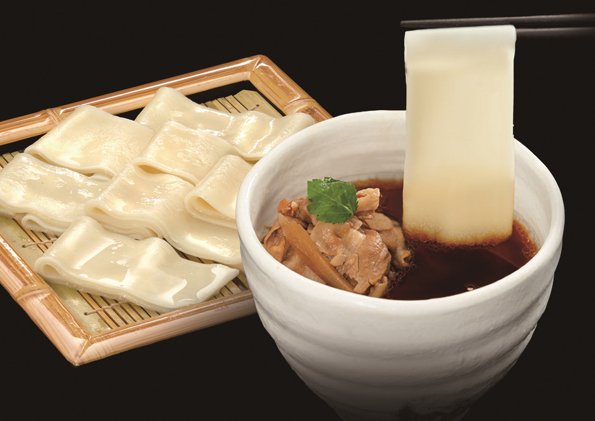 ゆであがり幅5cmのコシの強いもちもち麺が特徴です。コクのある肉汁つゆにつけてお召し上がりください。