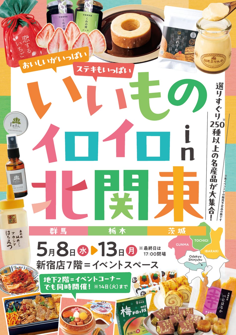 小田急百貨店新宿店7階のイベントスペースでは、5月8日(水)~13日(月)の期間、「いいものイロイロ in 北関東」を初開催します。栃木県出身の担当者の発案から生まれた新企画で、群馬、栃木、茨城の北関東3県の有名グルメから知られざるご当地品まで250種以上を一堂に展開します。テレビのグルメや観光特集で紹介されるなど、東京からも気軽に行けるスポットとしていま注目の北関東の名産品を紹介します。