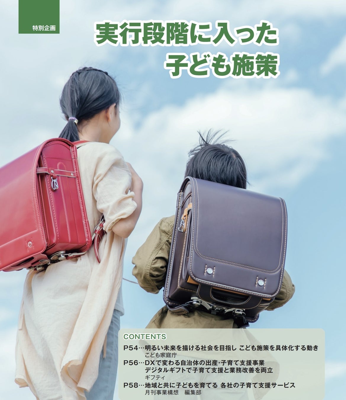 特別企画では、子ども施策に注目。発足から約1年半が経過した「こども家庭庁」によるこども大綱・こどもまんなか実行計画の説明、自治体こども計画立案のための解説を掲載。また、「eギフトプラットフォーム事業」を展開するギフティをはじめ、各社の子育て支援サービスを紹介する。