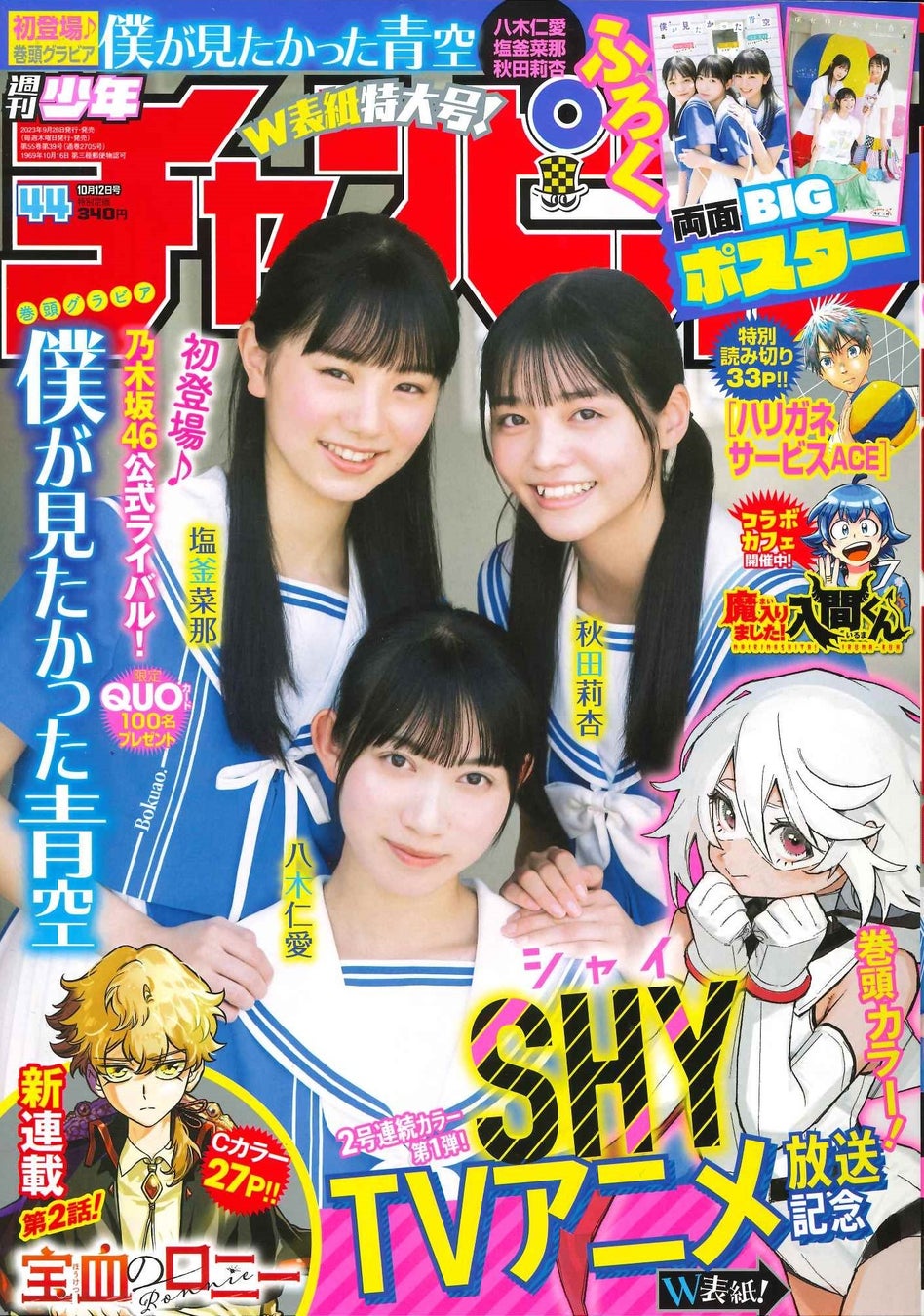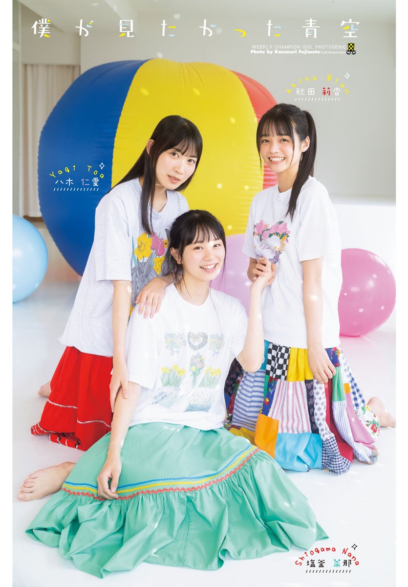 株式会社秋田書店(所在地:東京都千代田区、代表取締役社長:樋口茂)は、発行している週刊少年漫画誌『週刊少年チャンピオン』(編集長:武川新吾)9月28日(木)発売の44号にて、表紙&巻頭グラビアに「僕が見たかった青空」から八木 仁愛さん、塩釜 菜那さん、秋田 莉杏さんが登場することをお知らせいたします。両面BIGポスター付録、さらに限定QUOカード100名プレゼント企画も実施いたします。
