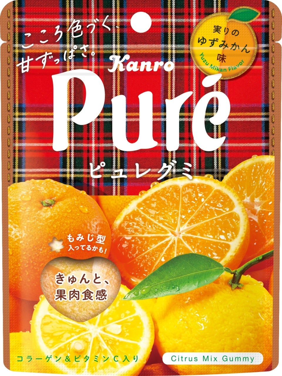 特徴 :香り高いゆずとジューシーなみかんの爽やかな味わいが楽しめるフルーツグミ