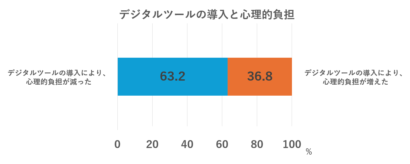 多くのデジタルツールが仕事・職場環境に導入されており、それらに対して労働者はどのような感情を抱いているのか、特に心理的負担に焦点を当てて尋ねたところ、デジタルツールの導入により「心理的負担が減った」と回答した人は63.2%、「心理的負担が増えた」と回答した人は36.8%であった。デジタルツールはどちらかというと、心理的負担の軽減に貢献していることを示唆する結果となった。