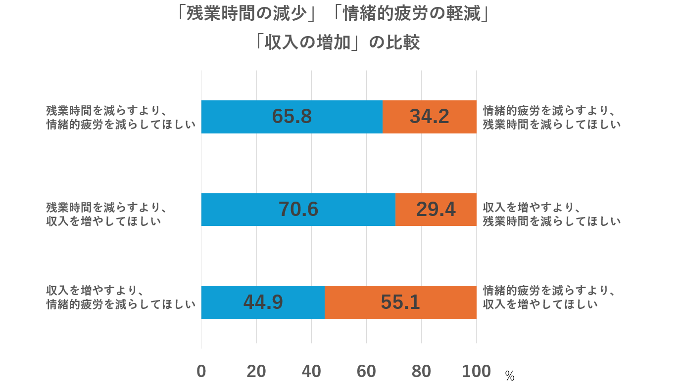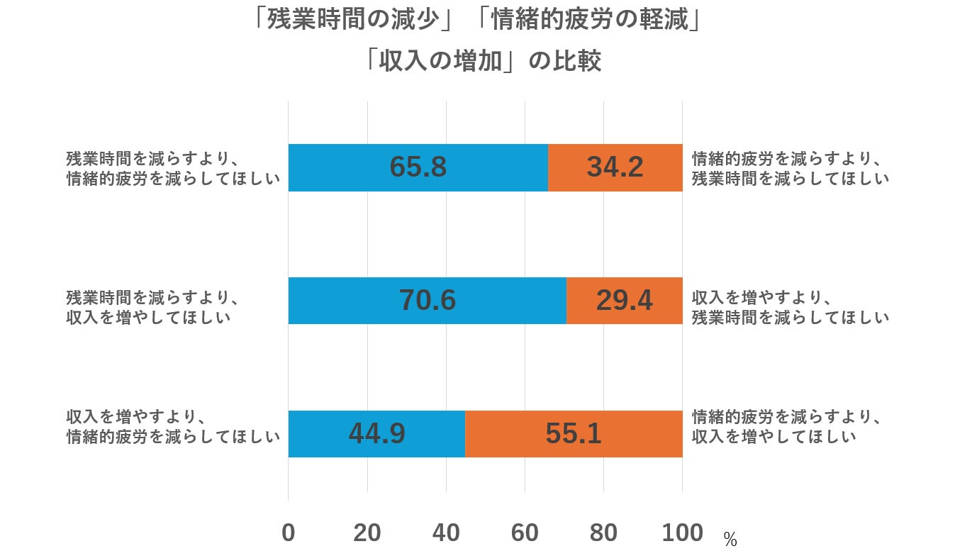 最後に、「収入を増やすより、情緒的疲労を減らしてほしい」と回答した人が44.9%、「情緒的疲労を減らすより、収入を増やしてほしい」と回答した人が55.1%と、情緒的疲労の減少より収入を増やすことへの期待が10.2ポイント高かった。