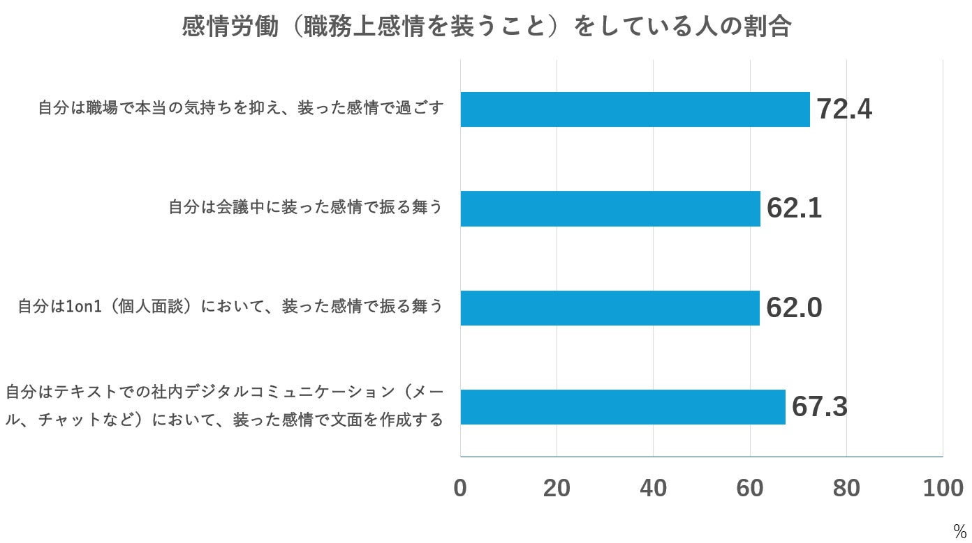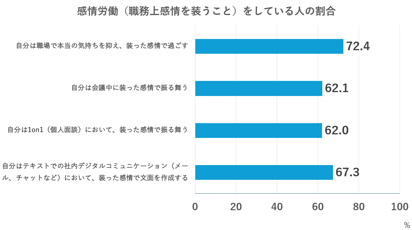 職場における感情労働について尋ねた質問で、「職場で本当の気持ちを抑え、装った感情で過ごす」人は72.4%にのぼり、多くの人が感情労働をおこなっている実態が明らかになった。「会議中に装った感情で振る舞う」人は62.1%、「1on1(個人面談)において、装った感情で振る舞う」人は62.0%を占めた。