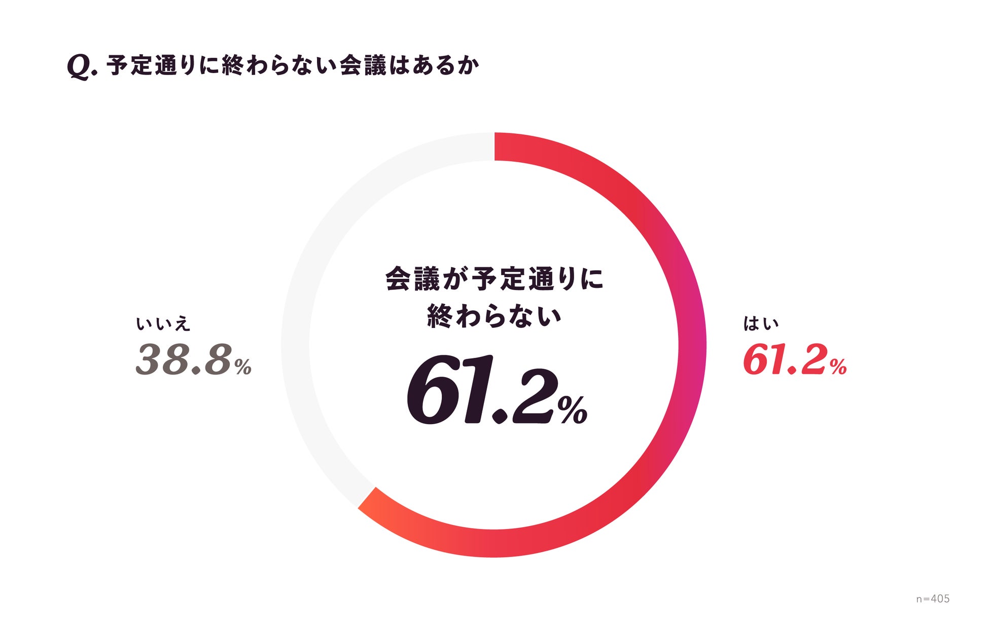 予定通りに終わらなかった会議はどの程度あるのか聞いたところ、「ほとんどない」が38.8%が回答。一方で、61.2%は予定通りに会議が終わらないという結果になりました。