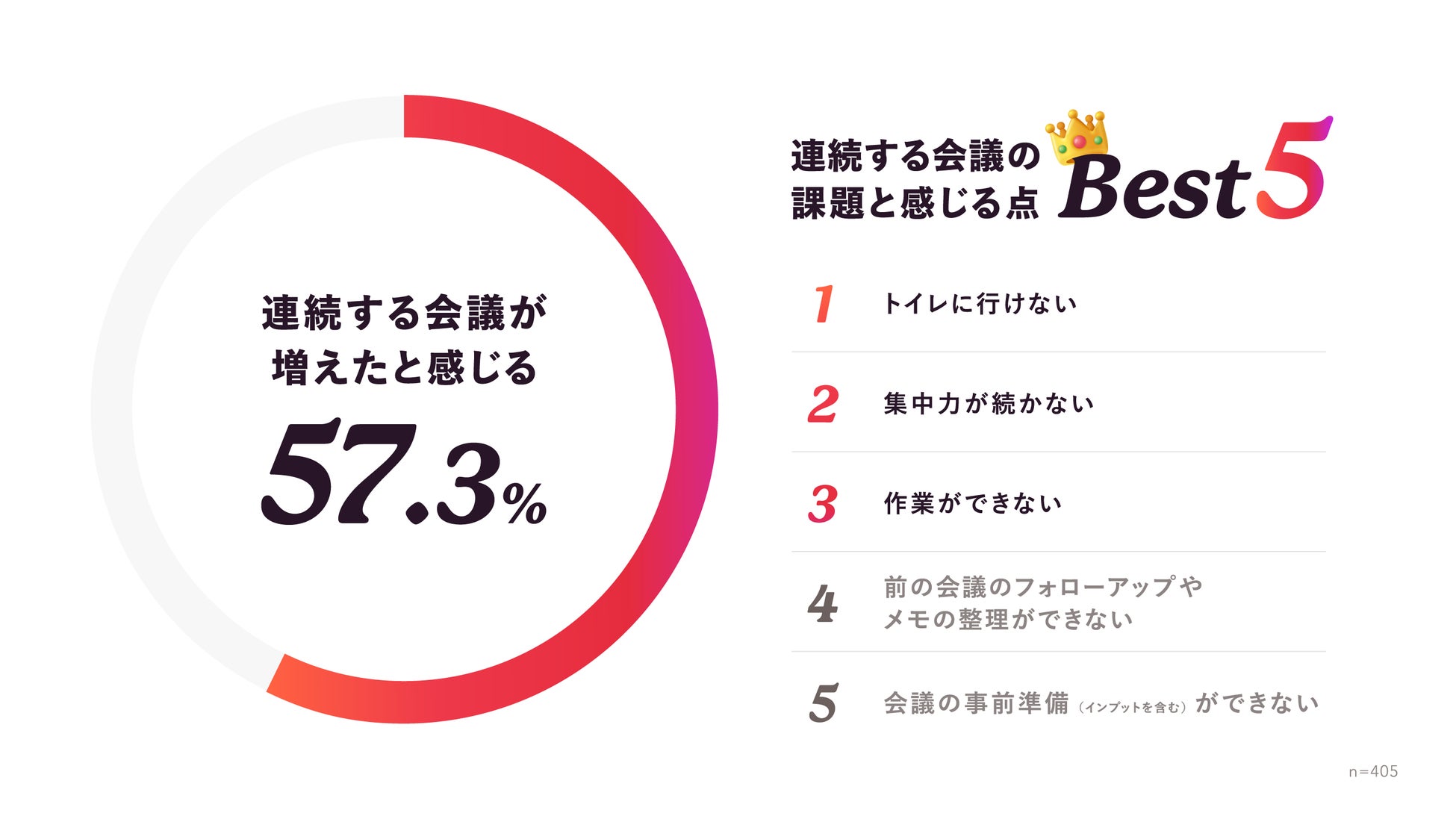 さらに、会議間のインターバルがないことによって感じる弊害を聞いたところ、下記回答が得られました。1位「トイレに行けない(58.5%)」、2位「集中力が続かない(53.1%)」、3位「作業ができない(48.1%)」、4位「前の会議のフォローアップやメモの整理ができない(39.0%)」、5位「会議の事前準備(インプット含む)ができない(33.6%)」。
