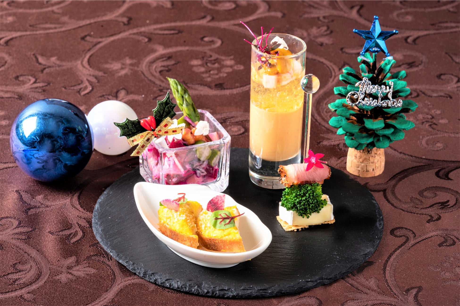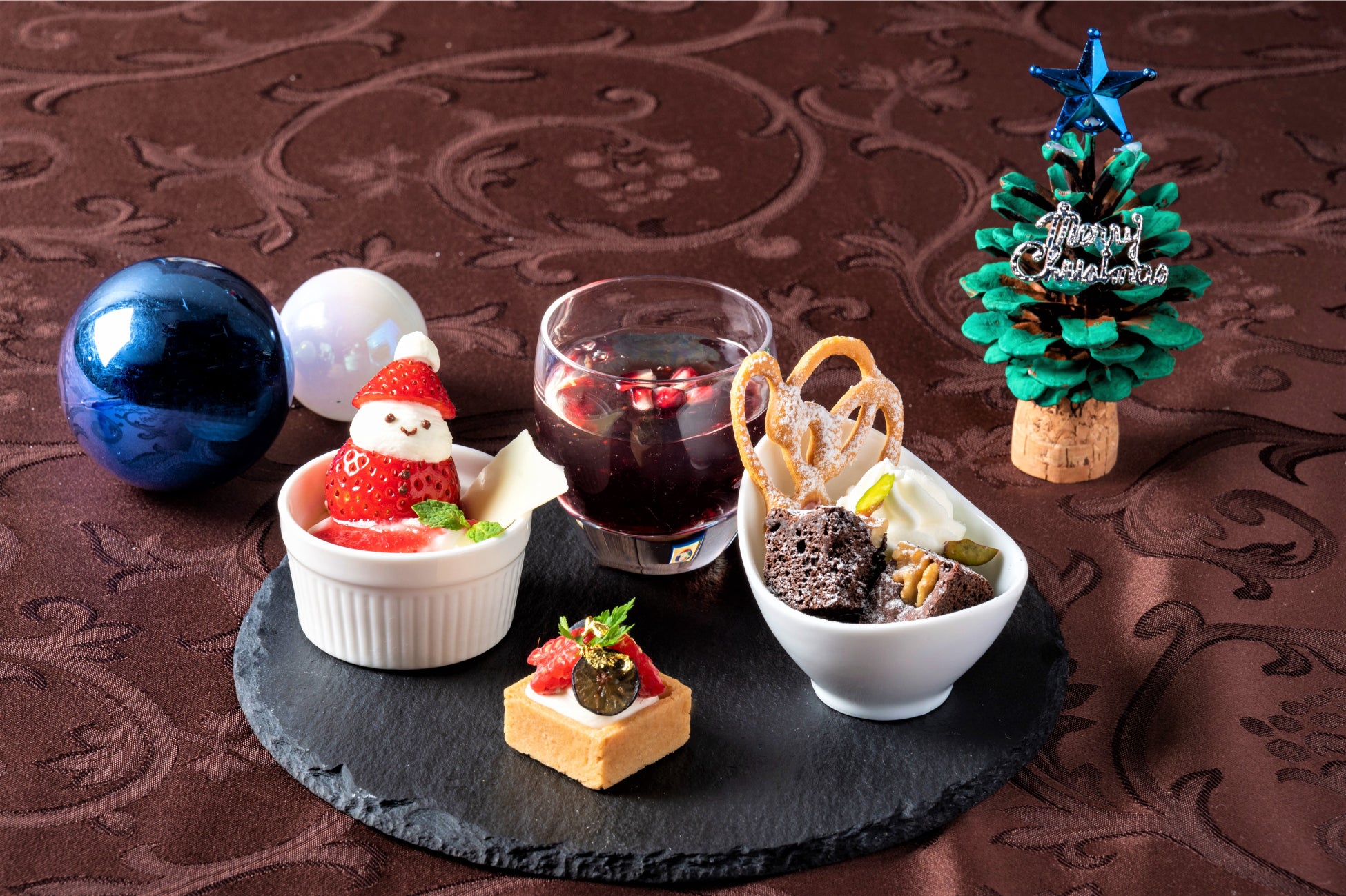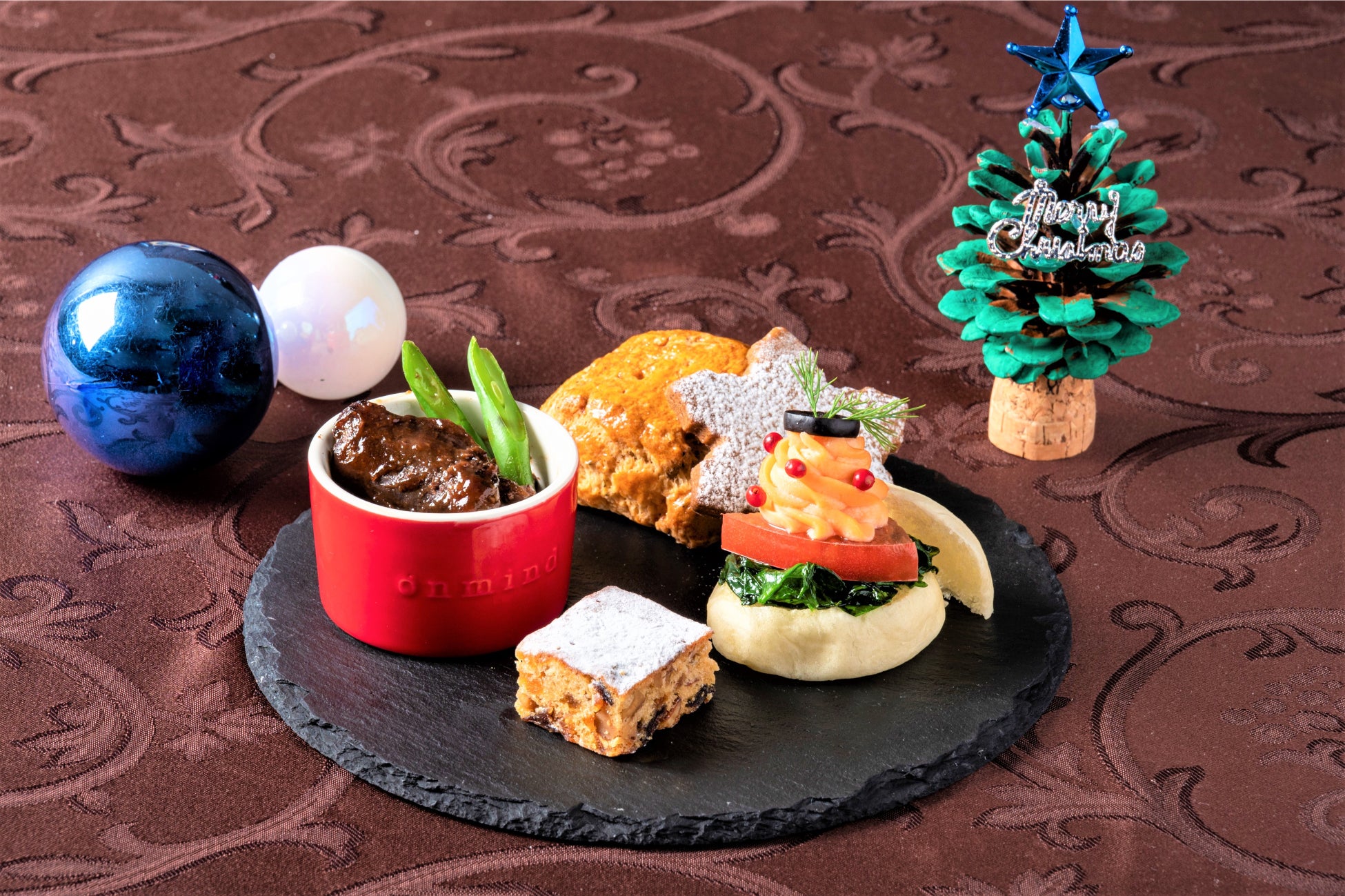 スイーツにはクリスマスの定番「シュトーレン」から着想を得た「フルーツナッツケーキ」や、「ザクロのジュレ」などが並びます。イチゴをサンタクロースに見立てあしらった「ヨーグルトとホワイトチョコのブランマンジェ」は、ホワイトチョコの濃厚な甘味とヨーグルトのさっぱりとした酸味を滑らかな口溶けとともにお楽しみいただける一品です。セイボリーでは、柔らかく味わい深い「牛肉赤ワイン煮」や、スモークサーモンをムース状に仕立て、レッドペッパーをアクセントにしたひと口サイズの「スモークサーモンムースのオープンサンド」など、全7種類のラインナップでご用意します。