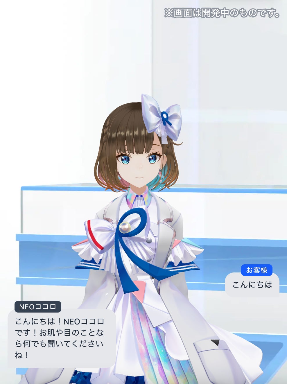 当社のVtuberである根羽清ココロをデジタルヒューマン化した「NEOココロ」が登場。サイネージ型モニターを使用し、アイケアやスキンケアに関する専門性の高い知識をお客様に提供します。英語や中国語にも対応しています。