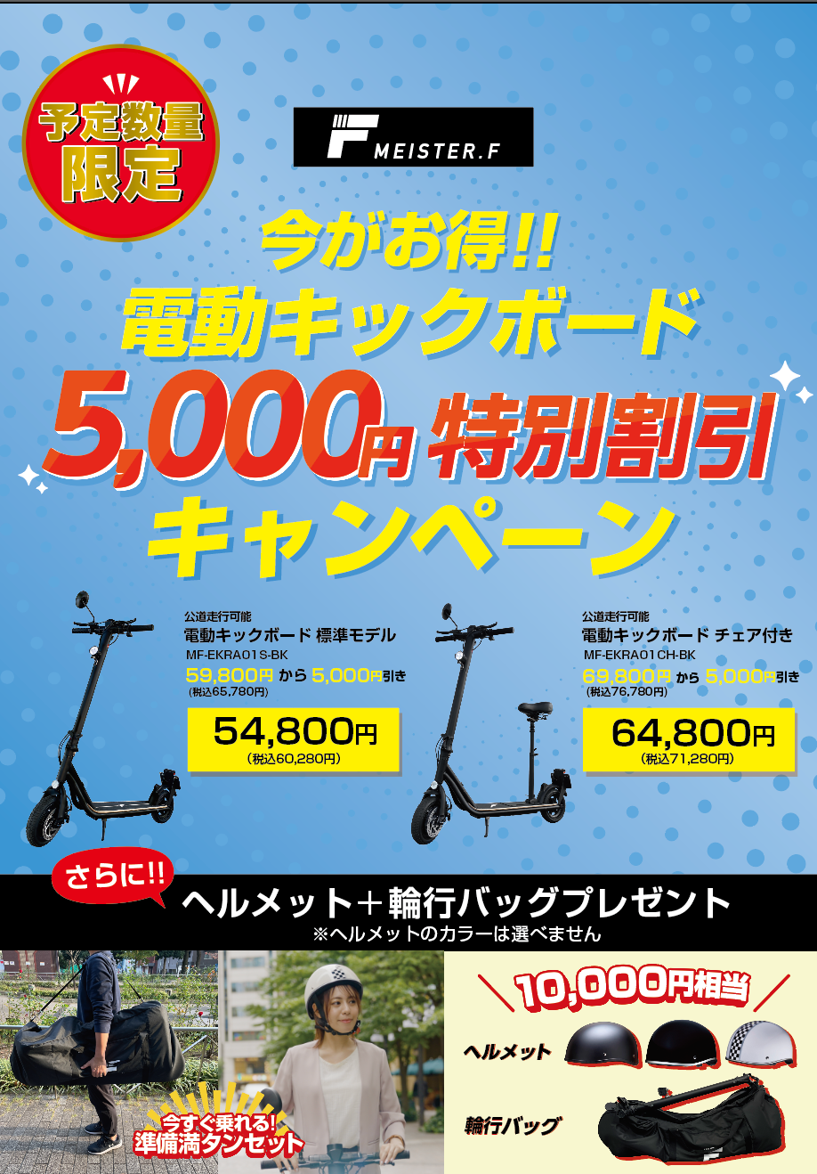 本年7月1日に施行された16歳以上運転免許証が不要の「特定小型原動機付自転車」区分の電動キックボードの予約販売も予定しております。