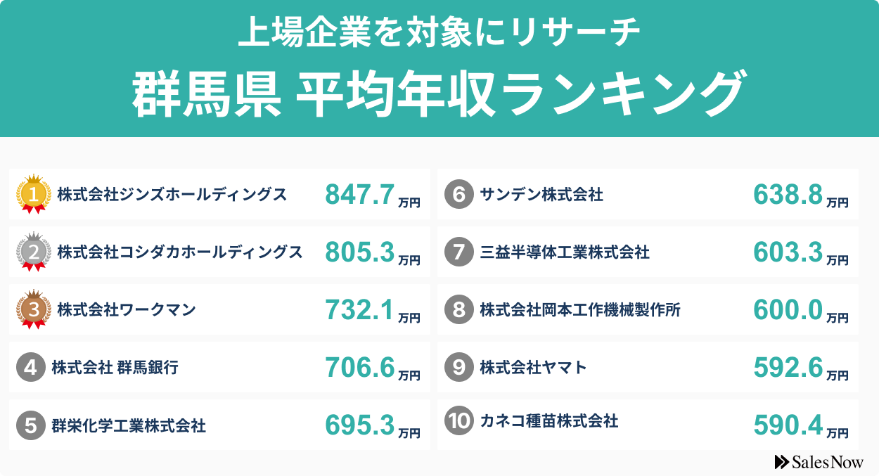 【群馬県】上場企業平均年収ランキングTOP10!/SalesNow DBレポート