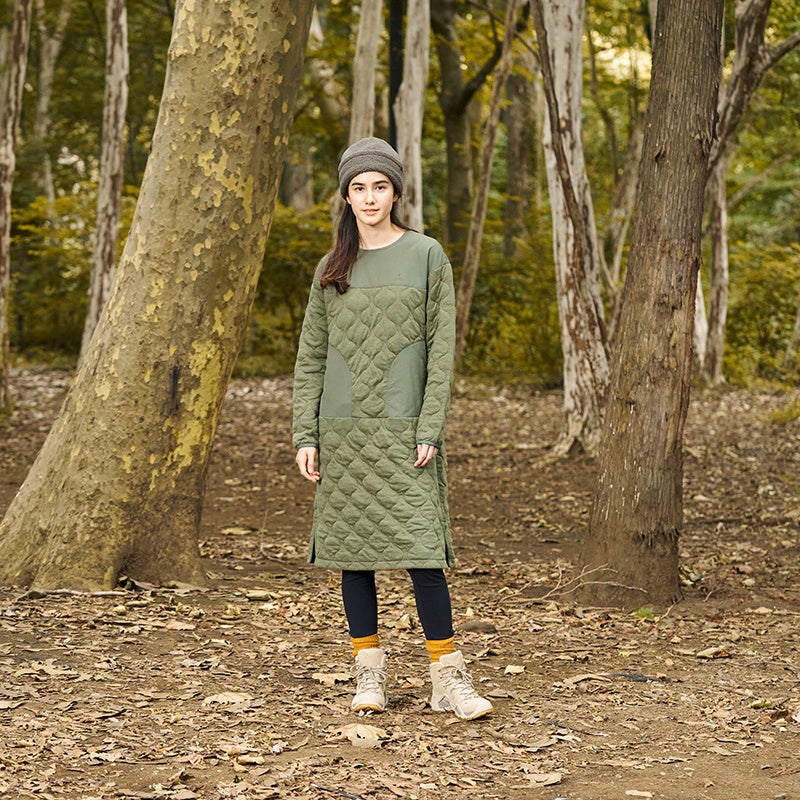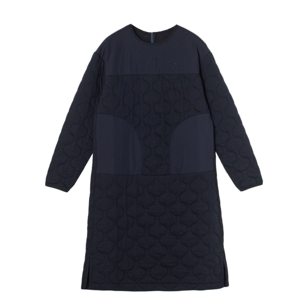 リサイクルポリエステルを使用した、S型のキルティングを施したワンピース。 両脇には大きめのハンドウォーマポケットがついています。裾部分にはスリットを入れ動きやすさを確保しています。