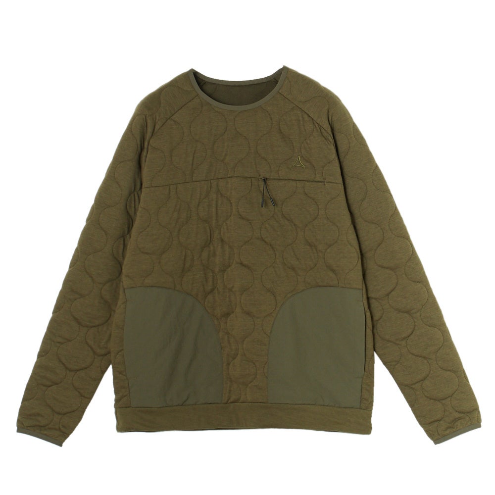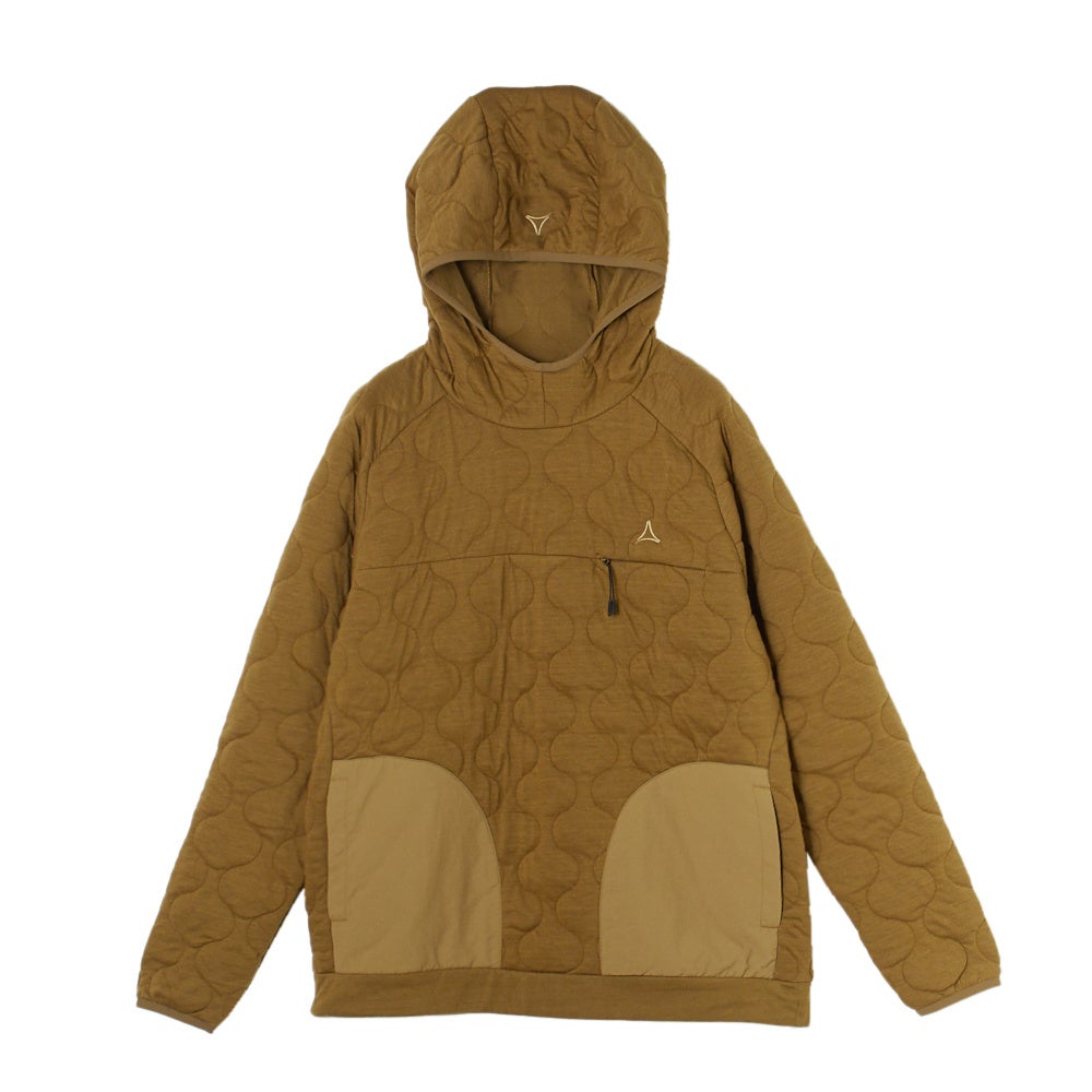 リサイクルポリエステルを採用した中綿キルトプルオーバー。左胸にZIP付きポケット、両脇には大きめのハンドウォーマポケットがついています。左脇部分にはドローコードがついており裾部分の調整が可能です。