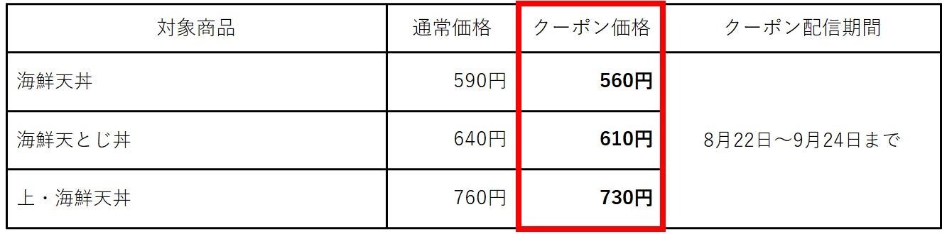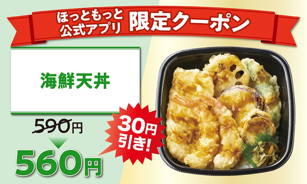 「ほっともっと」では、お客様に”もっと”お得にご利用いただくため、公式アプリにてアプリ限定のクーポンを配信しております。8月22日(火)より販売する新商品『海鮮天丼』の30円引きクーポンを同日22日(火)に配信いたしますので、ぜひこの機会に公式アプリをダウンロードし、お得に「ほっともっと」をご利用ください。