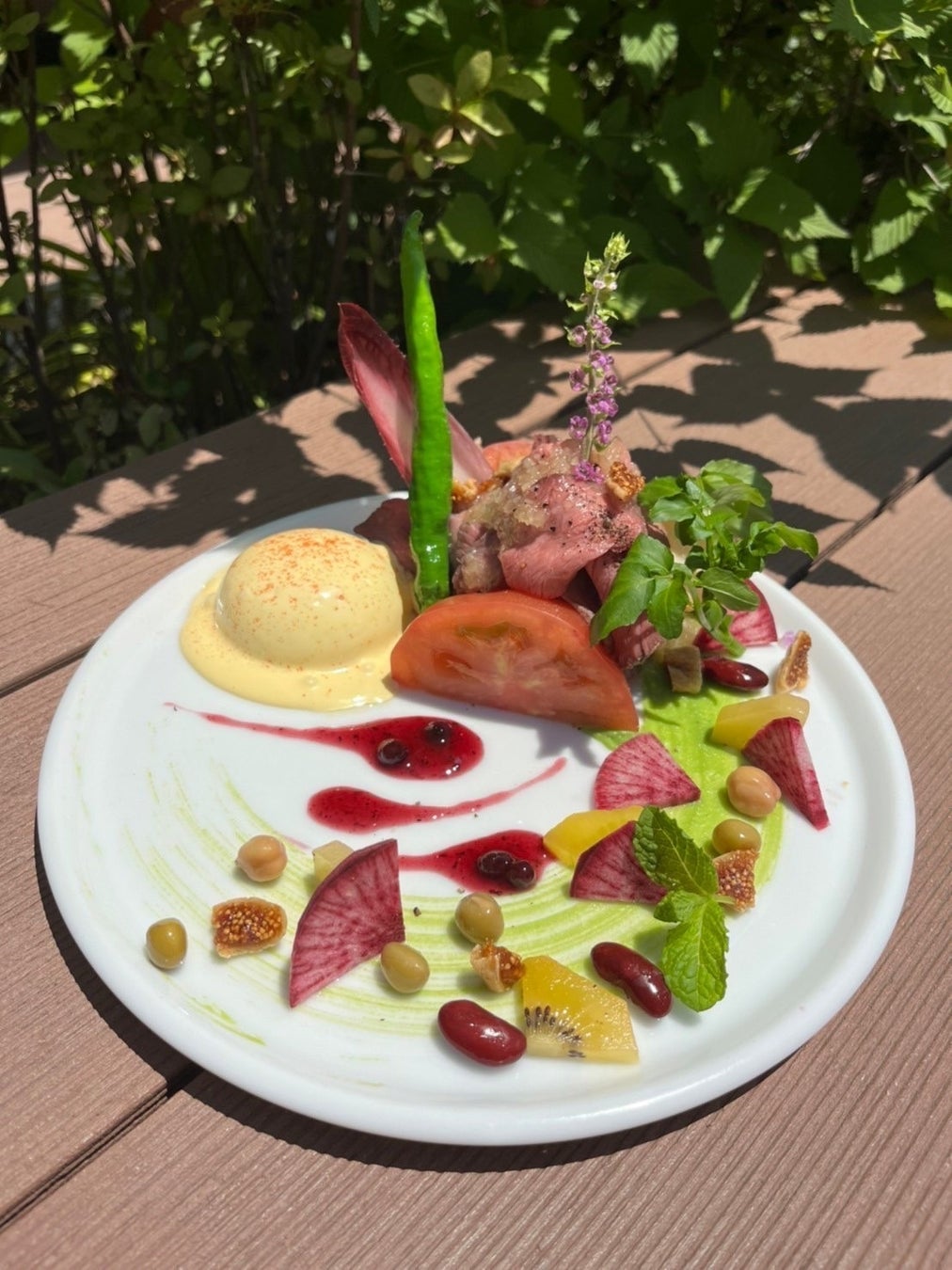 旬のゴールドキウイやブルーベリー、白イチヂクと色とりどりの野菜のマリアージュを