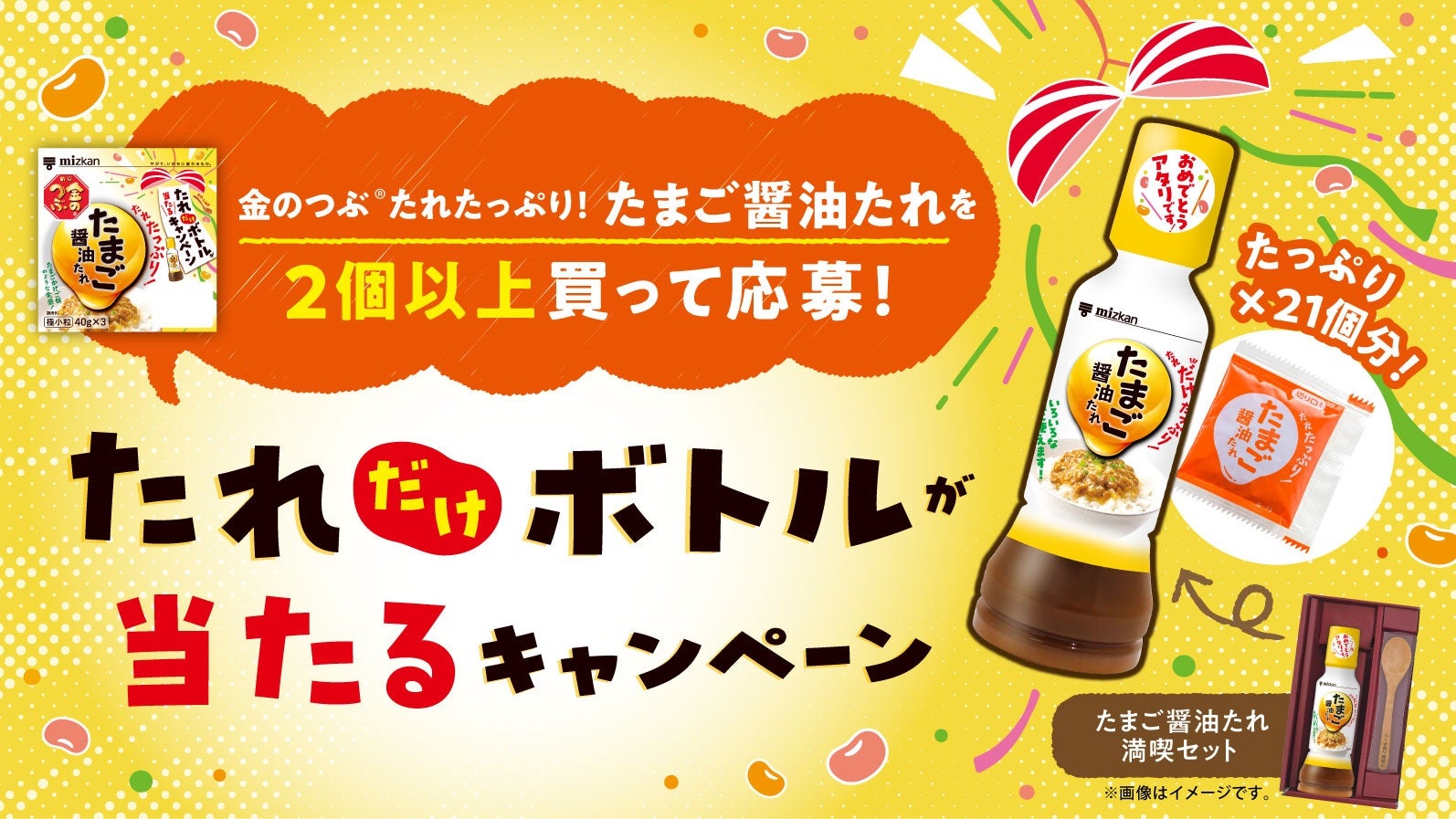 株式会社Mizkan(本社:愛知県半田市、代表取締役社長兼CEO:吉永智征、以下:ミツカン)は9月2日(月)より、「金のつぶ たれたっぷり!たまご醤油たれ」を期間中に2個以上ご購入いただいた方を対象に、「たれ“だけ”たっぷり!たまご醤油たれ」を含む「たまご醤油たれ満喫セット」が抽選で300名様に当たるキャンペーンを開始いたします。