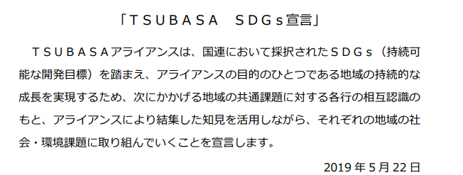 2019年5月には「TSUBASA SDGs宣言」により、地域の共通課題に対する各行の相互認識のもと、アライアンスにより結集した知見を活用しながら、社会・環境問題に取組んでいくことを宣言しています。
