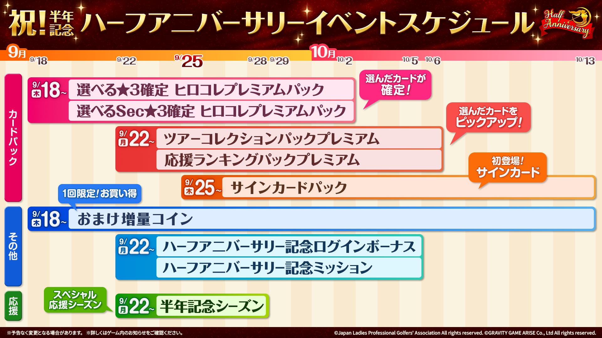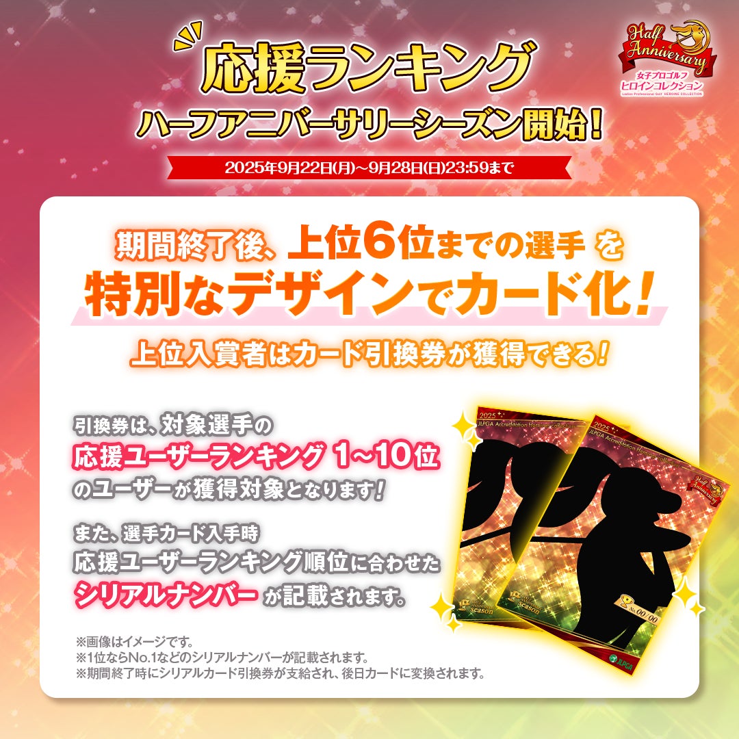グラビティゲームアライズ株式会社(所在地:東京都中央区)は、2025年9月25日(木)にサービス開始半年を迎えるJLPGA初の公認ゲームアプリ『女子プロゴルフ ヒロインコレクション』につきまして、半年記念イベントを開催することを決定いたしました。選んだ選手カードが確定するパックやサイン入りカードが入手できるパックなどが登場する特別なイベントとなります。