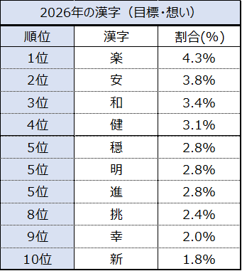 ■来年2026年の漢字(目標・想い)1位は2年連続で「楽」