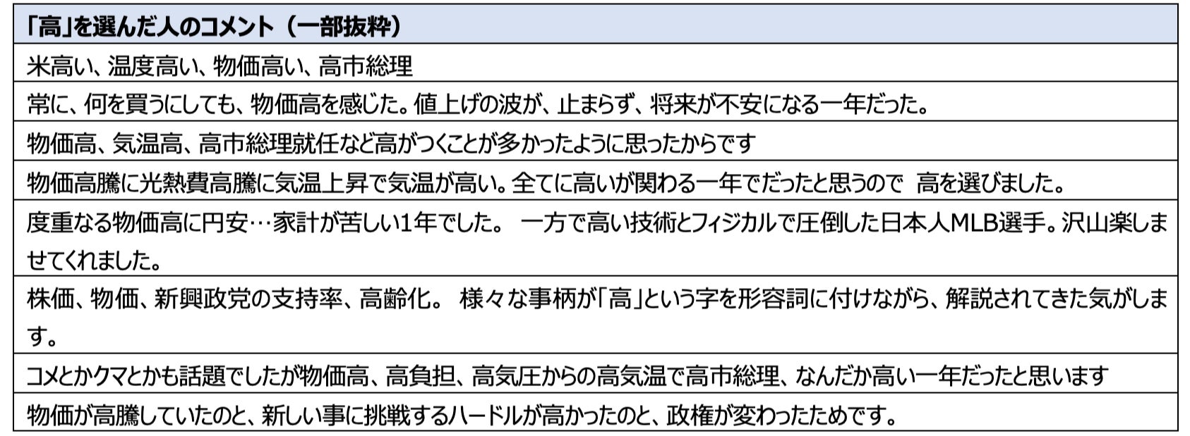 2位の「高」は昨年に続くランクインですが、今年は物価・金利などが “高い” という生活実感に加え、日本初の女性首相となった「高市早苗」氏の名字を想起して投票した人が多かった点が特徴的でした。【表5】