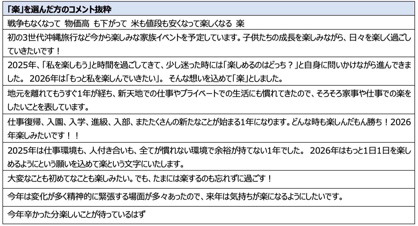2026年への目標や想いを表す漢字として、昨年に続き2年連続1位となった「楽」。この漢字は「たのしい」と「らく」の二つの読みと意味を併せ持っており、①明るく充実した1年を“楽しみたい”前向きさと、②心身・経済的負担を“ラク”にしたい切実さの双方を同時に表現できる漢字であると言えます。コロナ禍や物価高など“重い”数年を経験したからこそ、来年こそは「明るさ」と「ゆとり」の両方を取り戻す1年にしたいという切実な思いが、「楽」を選んだ方のコメントからも読み取れます。【表2】