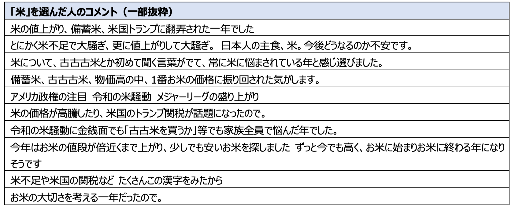 2025年を表す漢字の第1位は「米」でした。今年は上位3文字だけで投票総数の約2割を占めており、人びとの記憶に強烈なインパクトを残した出来事が集中していたことがうかがえます。(昨年の上位3文字合計は8.6%)