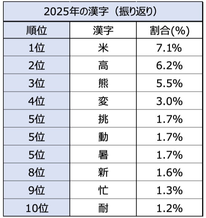 ■2025年の漢字(振り返り)1位は圧倒的に「米」。2位は「高」、3位は「熊」という結果に