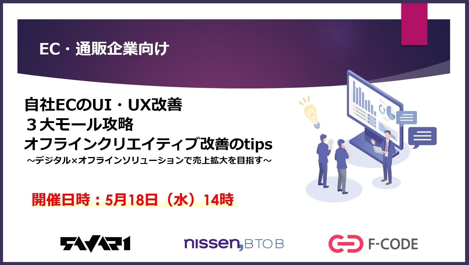 株式会社ニッセン(本社:京都市南区、代表取締役社長:羽渕淳)の通販支援事業部門「nissen,BtoB」は、2022年5月18日(水)14時00分より、EC・通販事業者向けに、サヴァリ株式会社(本社:東京都中央区、代表取締役社長:福田 泰志)、株式会社エフ・コード(本社:東京都新宿区、代表取締役:工藤 勉)との共催で、「自社ECのUI・UXの改善 3大モール攻略 オフラインクリエイティブ改善のtips」と題したウェビナーを開催いたします。