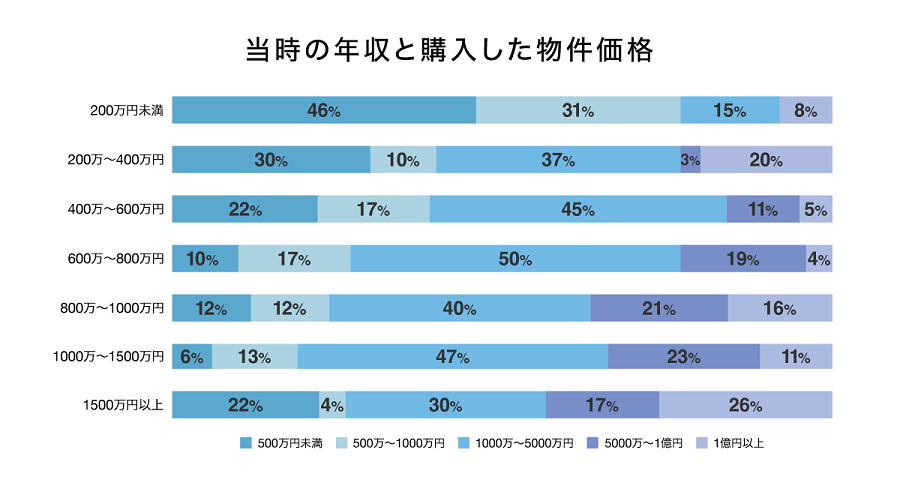 アンケート結果からは、年収と購入した物件価格の相関関係が見えてきました。年収が増えると、購入した物件価格のボリュームゾーンが高価格帯にシフトしています。
