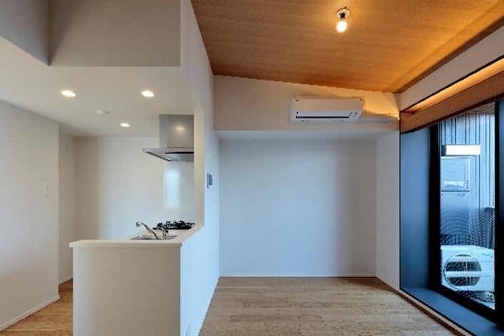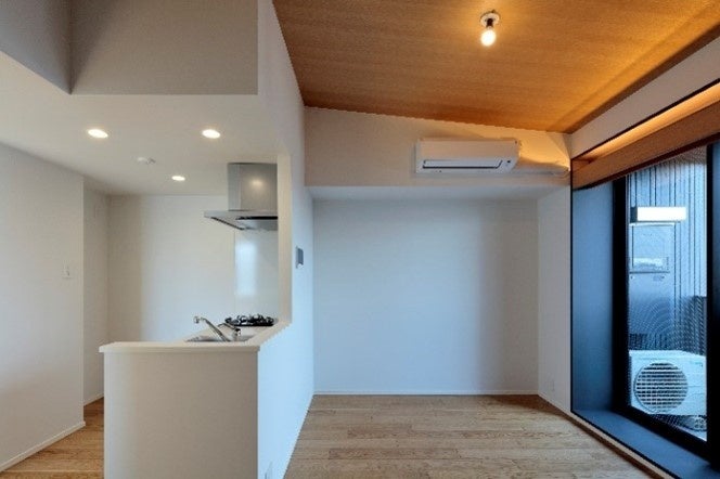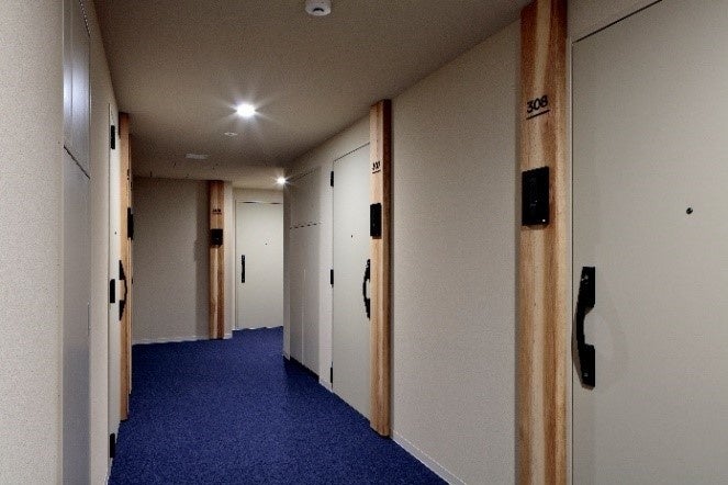 また各住戸のエントランスには釜石市のFSC認証林から伐採した木材で制作したインターホン・室名札パネルを設置しており、居住者の方が帰宅する際に美しい木目が出迎えます。居室内には従来木部が露出していないため、木を身近に感じられるように天然木を使用した棚板をトイレへ設置、一部住戸には壁・天井面に天然木クロスを使用し、本物の木の手触りや香りと、印刷では表せない微妙に異なる柄と色、変化していく色合いをお楽しみいただけます。天然木クロスのほのかな香りは、心身をリラックスさせ快適な空間を創出し、住まわれた方がまるで自然の中で暮らしているような日常生活を実現します。