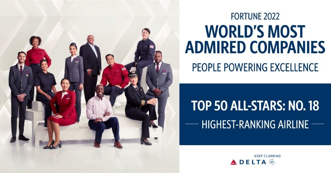 デルタ航空、フォーチュン誌の「世界で最も賞賛される企業」の第18位に