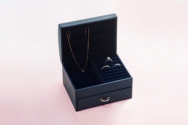 ジュエリーが美しく映え、大切に守る上質な作りのジュエリーボックスをご用意しています。ネックレスをかけるフックや引き出し付きで収納力抜群。ネイビーのレザー調ボックスにシルバーの金具がついたシックな印象でどんなインテリアにも馴染みます。