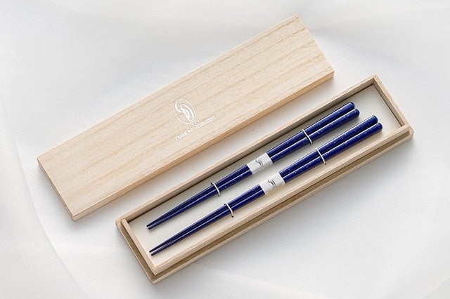 お箸専門店「箸蔵まつかん」と共同開発したオリジナル夫婦箸。ブランドコンセプトのギリシャ・エーゲ海とキラキラした輝く水面を表現しています。持ち手部分はフィットしやすく、実用的なアイテムです。