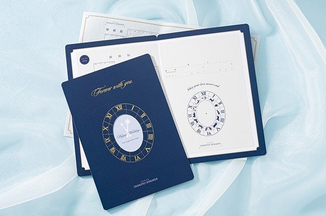 銀座本店のシンボルである時計をモチーフにした婚姻届。提出用と保管用をご用意しています。保管用は写真を貼ることも可能です。また、内側には星座がちりばめられた時計のイラストが描かれており、上にリングを置いて写真を撮影することもできます。おふたりがご夫婦になられる特別なアイテムが素敵な思い出となるようにご用意させていただいております。