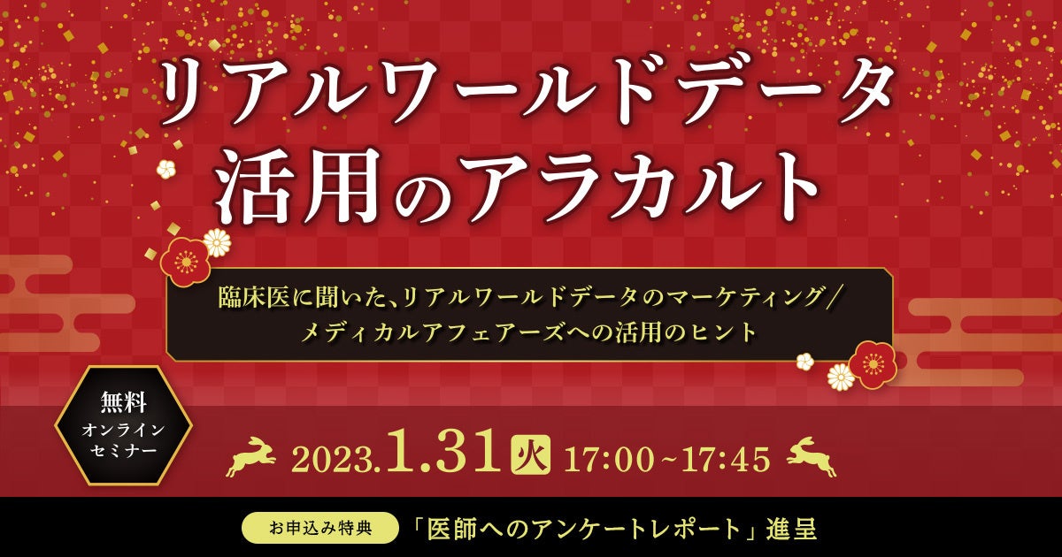 本セミナーは「リアルワールドデータ活用のアラカルト~臨床医に聞いた、リアルワールドデータのマーケティング/メディカルアフェアーズへの活用のヒント~」と題し、製薬企業のマーケティングやメディカルアフェアーズに関わる方を対象に実施します。「リアルワールドデータ」に関する医師への調査結果を基に、「マーケティング部門・メディカルアフェアーズ部門が医師とのコミュニケーション時にどのようにリアルワールドデータを活用すべきか」について具体的な手法を紹介する内容となっています。