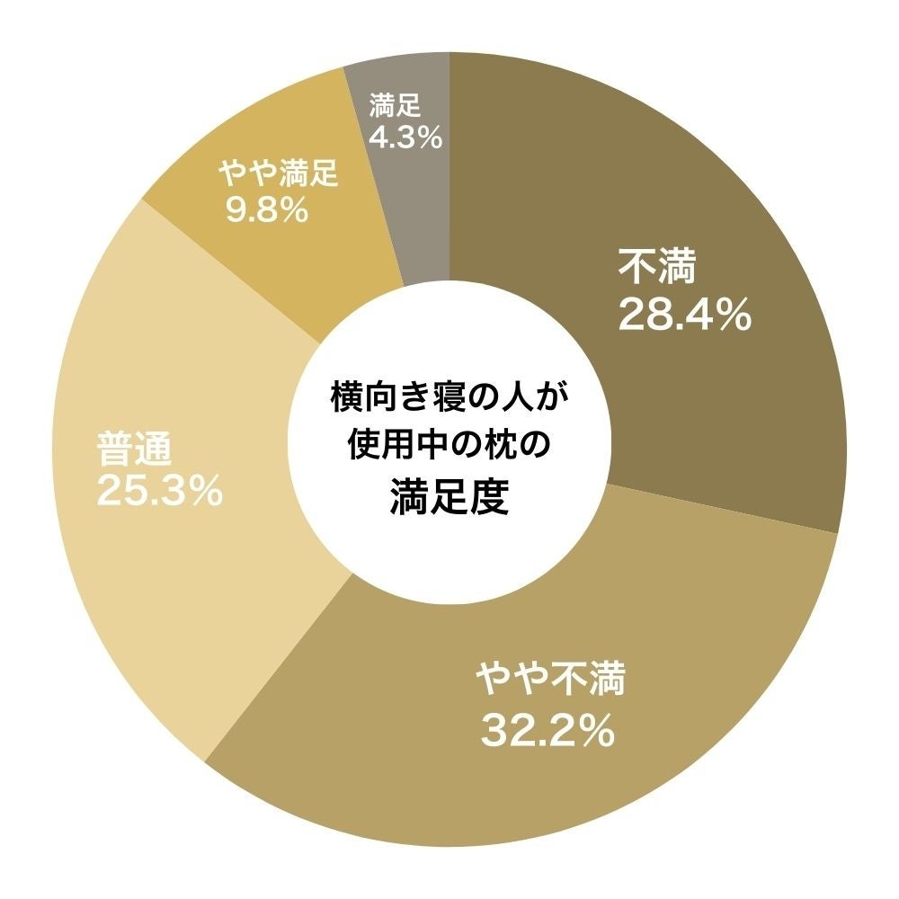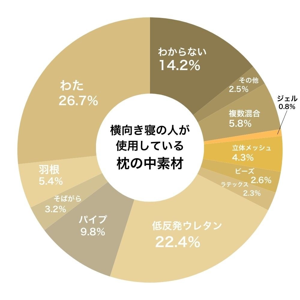 そのほか、12万件の睡眠統計データによる、横向き寝を好む人の特徴や好みを枕に反映。「お使いの枕に満足しているか?」の質問に、「不満・やや不満」と回答した人が6割を超えており、また、「お使いの枕の中素材は?」の質問では、「わた・低反発ウレタン」といった、柔らかめの素材を使用している人が半数程度いることから、しっかりと頭と首をサポートできるよう、「わた・低反発ウレタン」より安定感のある感触を再現し、「満足」と回答している人の寝心地に近づけました。