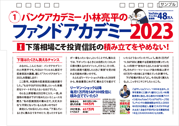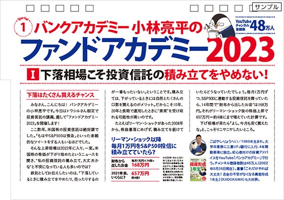 楽天証券では、各月に権利確定日を迎える5銘柄の株主優待情報や、主要経済指標の発表日、株主優待・配当の権利付き最終日など、株式投資などに役立つ情報を紹介するオリジナル卓上カレンダー「株主優待カレンダー by トウシル」を毎年制作しており、多くのお客様にご好評いただいています。2023年版の「株主優待カレンダー byトウシル」は、人気の各月株主優待情報や主要経済指標発表日はもちろん、人気インフルエンサーの投資スタイルや注目銘柄などの情報もお届けします。人気インフルエンサーとして、YouTubeチャンネル「BANK ACADEMY」を運営する資産運用YouTuberの小林 亮平氏から投資信託の投資スタイルを、投資系YouTuberのたぱぞう氏から海外ETFの魅力や注目銘柄、投資方法などをご紹介いただきます。また、各月カレンダーには、一粒万倍日や天赦日、寅の日など、日本古来より伝わる開運日情報を新たに追加します。