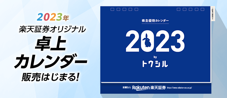 楽天証券株式会社(本社:東京都港区、代表取締役社長:楠 雄治、以下「楽天証券」)は、2022年11月4日(金)より、楽天証券オリジナル卓上カレンダー「株主優待カレンダー by トウシル」の2023年版を制作し、楽天グループ株式会社(本社:東京都世田谷区、代表取締役会長兼社長:三木谷 浩史、以下「楽天」)が運営するオンライン書店「楽天ブックス」で販売することをお知らせします。また、発売に先駆けて、本日、10月6日(木)より、「楽天ブックス」で予約販売を開始したことをあわせてお知らせします。