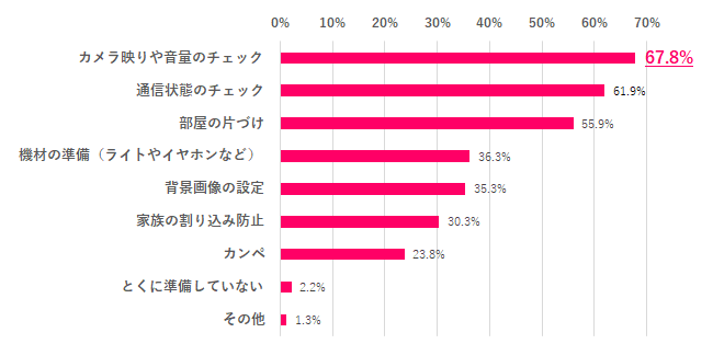 Web面接をするにあたって、準備したことは何かを尋ねると、1位「カメラ映りや音量のチェック」67.8%、2位「通信状態のチェック」61.9%、3位「部屋の片づけ」55.9%となりました。Zoomなどの面接ツールは背景画像を設定したり、ぼかし機能があるにもかかわらず、約半数の人が部屋を片付けていることがわかります。また、約2割の人が「カンペ」を準備しています。その他コメントの中にも、「カメラ目線に見える位置にカンペを貼った」もありました。