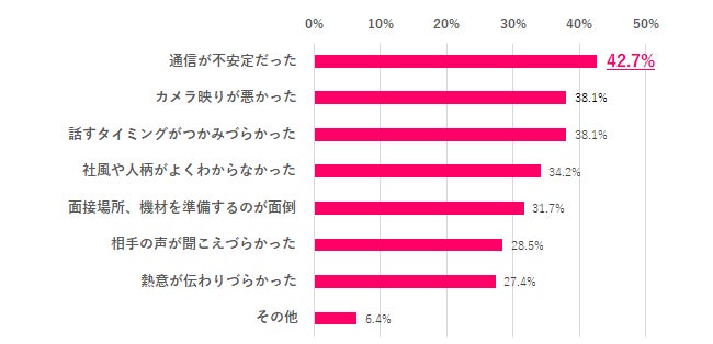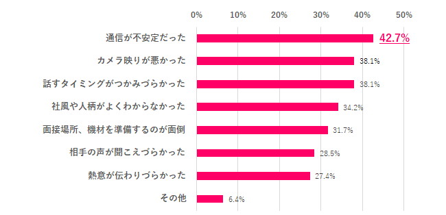 Web面接で悪かったこと(困ったこと)については、1位「通信が不安定だった」42.7%、2位は同率で「カメラ映りが悪かった」「話すタイミングがつかみづらかった」38.1%でした。その他のコメントとしては、「飼っているペットがうるさかった」「カンペを用意できるからつい準備不足になりがち」「面接官の顔がアニメだった」などがありました。