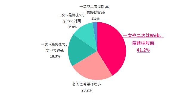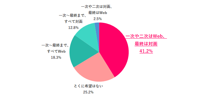 多いことがわかります。逆に40代は「一次~最終まで、すべて対面」が3位にランクインしており、20代より10%多い結果です。Webだけで問題ないとする20代と、リアルにこだわる40代の世代間ギャップが垣間見られる結果となりました。