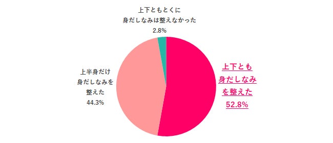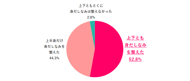 Web面接時の身だしなみについて尋ねると、「上下とも身だしなみを整えた」が52.8%と過半数になっているものの、「上半身だけ身だしなみを整えた」も44.3%とかなりの割合を占めています。リモートワークに関する調査(※1)でも、リモートワーク中の約3割の人が「下半身パジャマ」の経験を持っており、Web面接時も画面に映らない部分は気が緩みがちな状況が見て取れます。