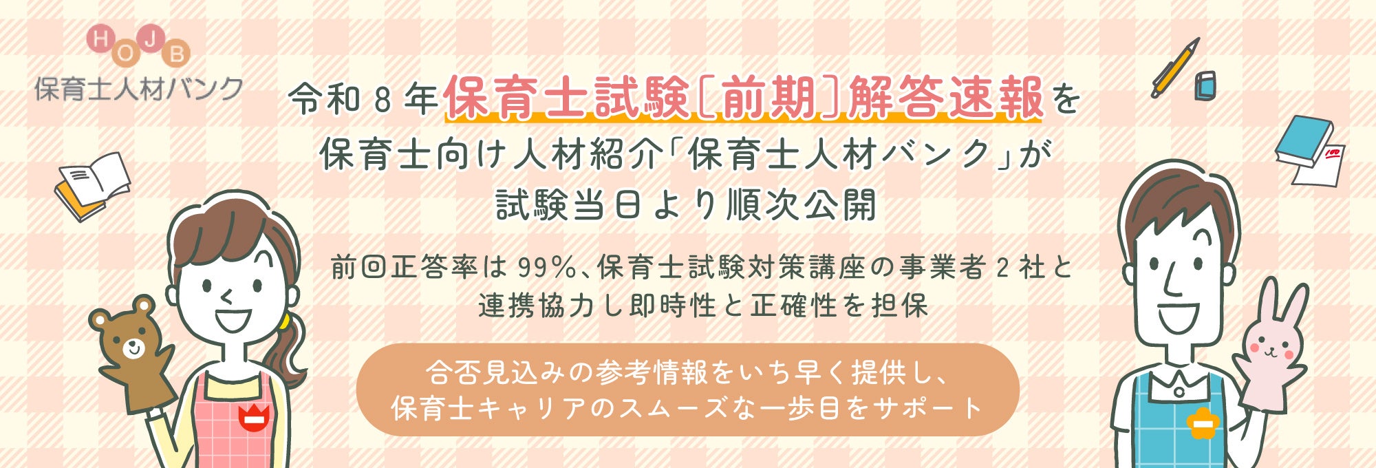 株式会社エス・エム・エス(本社:東京都港区、代表取締役社長:髙畑正樹、東証プライム、以下「当社」)が運営する保育士向け人材紹介「保育士人材バンク」(URL:https://hoiku.jinzaibank.com/)は、2026年4月18日(土)、19日(日)に実施される「令和8年保育士試験[前期]」の解答速報を試験当日よりサービスサイトにて順次公開します。試験の受験者はLINE公式アカウントの友だち追加を行うことで、解答速報発表の通知を受け取ることができます。