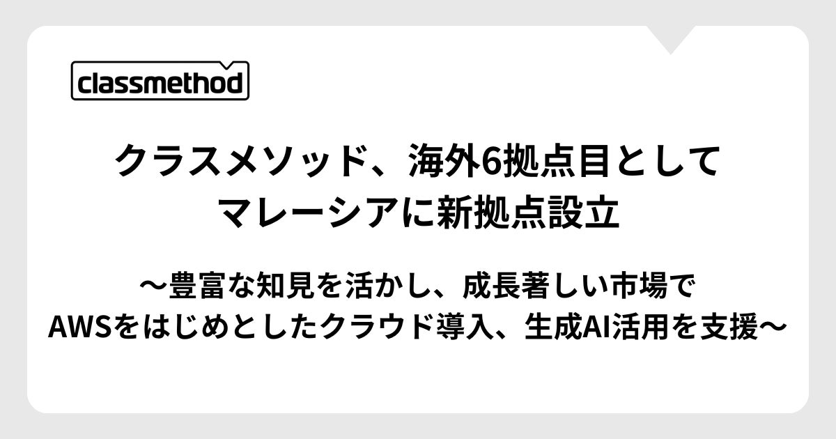 クラスメソッド株式会社(本社:東京都港区、代表取締役:横田聡)は、クラウド活用および生成AIを軸とした技術支援体制を強化するため、マレーシア・クアラルンプールに100%子会社「Classmethod Malaysia Sdn. Bhd.(クラスメソッド・マレーシア)」を設立しました。