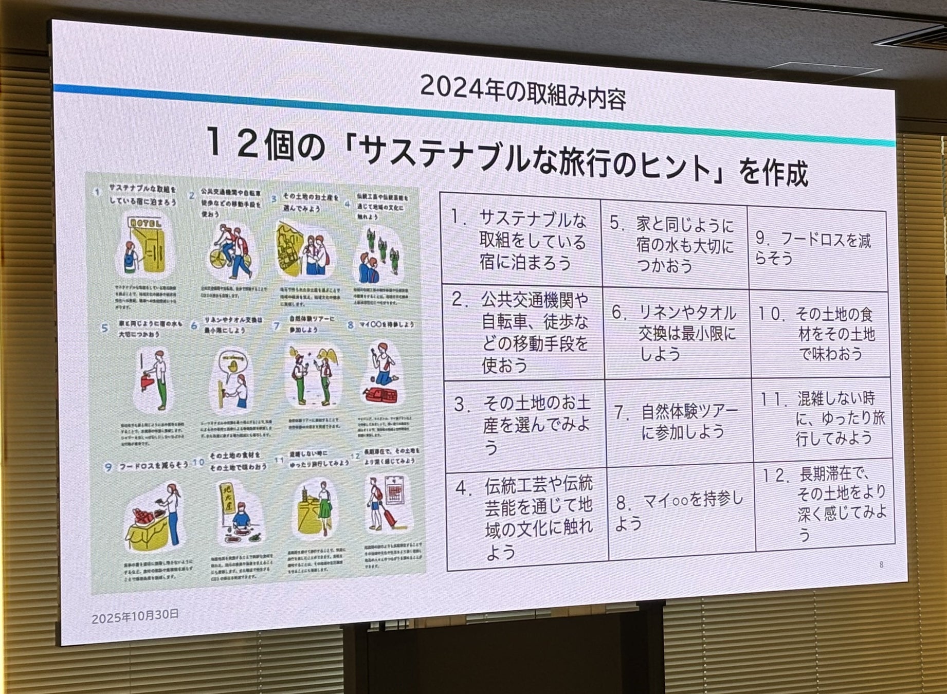 世界の旅行者においてサステナビリティは旅行先選定の重要な要素となっている 一方、日本の旅行者はまだ関心が薄い状況であると同時に、「サステナビリティに関する選択肢が少ない(見つけられない)」 という課題も認識されています。これらの課題に対し、3社は2024年に、旅行者が取り組みやすい12個の「サステナブルな旅行のヒント」を作成し、「ツーリズムEXPOジャパン2024」や「宿フェス」など観光業のイベントで啓発活動を行いました。