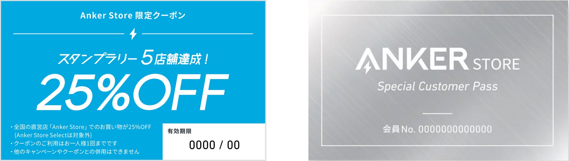 スタンプラリーは全国のAnker Store、20店舗にて開催し、来店いただいた店舗でスタッフにAnker Japan 公式アプリ内の会員バーコード(※)をご提示いただくと、各店舗のオリジナルデザインスタンプを会員ページ上に集めることができます。1店舗分のスタンプでAnker StoreやAnker Japan公式サイトでお使いいただけるポイントを100ポイント(=100円分)、Anker Store店頭でのお買い物が【5周年×5店舗】で25%OFFとなるクーポンをプレゼント致します。さらに、20店舗分のスタンプを集めると発行日から1年間は全国のAnker Storeでのお買い物が何度でも25%OFFとなる「Anker Storeスペシャルカスタマーパス」をプレゼント致します。ぜひ、全国のAnker Storeにお立ち寄りください。