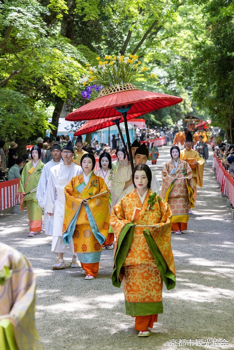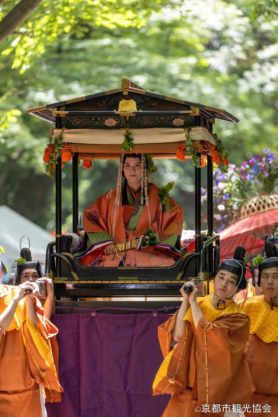 京都人の心意気と誇りの象徴とも言われ、初夏の京都を代表する「葵祭」。それぞれの役に扮した華やかな宮廷装束の511名の人々、馬36頭、牛4頭、牛車2基、輿1台の、長さ約1キロに及ぶ大行列が、およそ8キロもの距離を練り歩きます。専属のスタッフによる解説をリアルタイムで聞けるイヤホンガイド付きで、より深く祭りの魅力に触れられます。