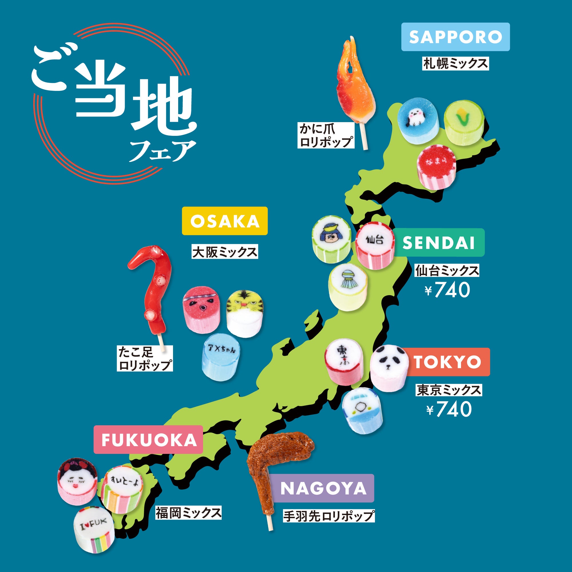 そこで、これまでのご愛顧に感謝を込め、20年間培ってきたレシピや技術の粋を集めた特別企画を開催いたします。その第二弾として、全国のパパブブレ店舗にて販売しているご当地限定商品をはじめ、日本各地の特産品をモチーフにしたユニークなキャンディを多数取り揃えた「ご当地フェア」を実施いたします。