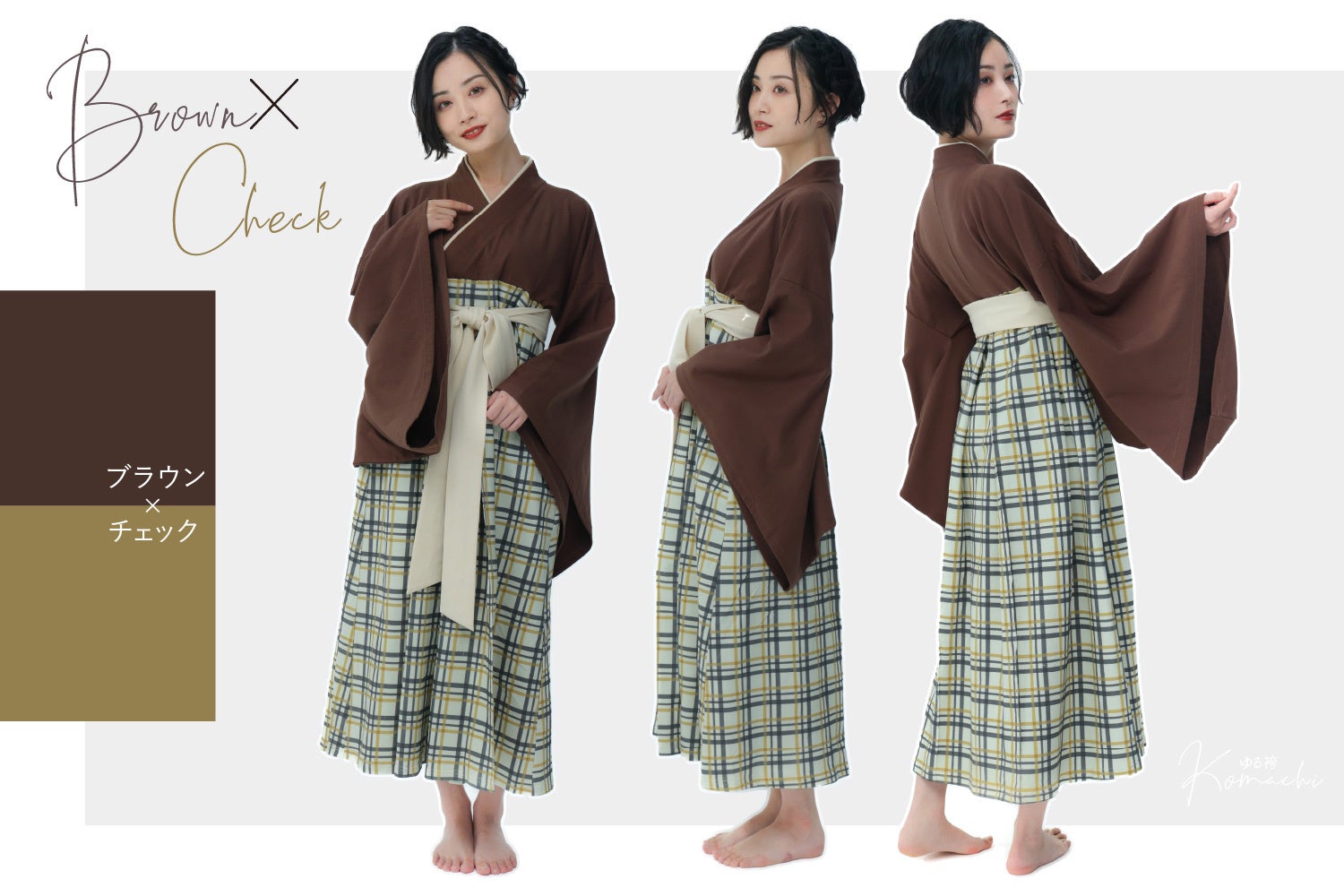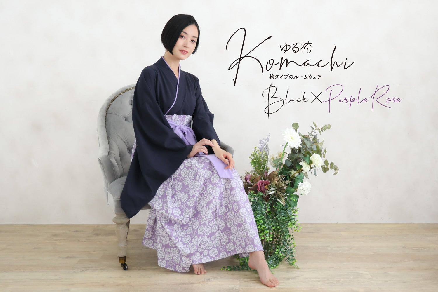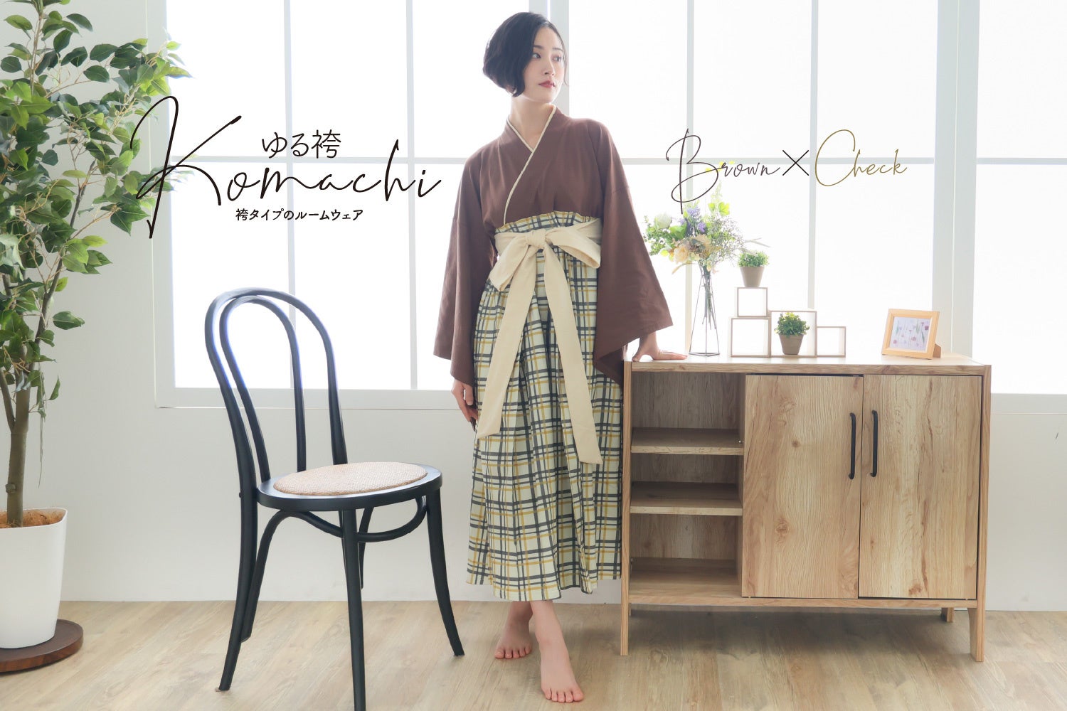 シリーズ第10弾の「ゆる袴」は、袴部分にプリントを施した新しいスタイル。トレンド感を意識しつつ、どなたでも着やすいカラーで、レディースのみの「Brown×チェック」と「Black×パープルローズ」「Gray×フラワーリーフ」を各3サイズで展開となります。デザインコンセプトに「小町(コマチ)」を掲げており、「○○小町」のように美しい女性の呼び名として使われるというところから、華やかな花モチーフやトレンド感のあるチェック柄を採用いたしました。今までのゆる袴とはまたひと味違った装いでおうち時間をお楽しみいただける綿100%のルームウェアです。