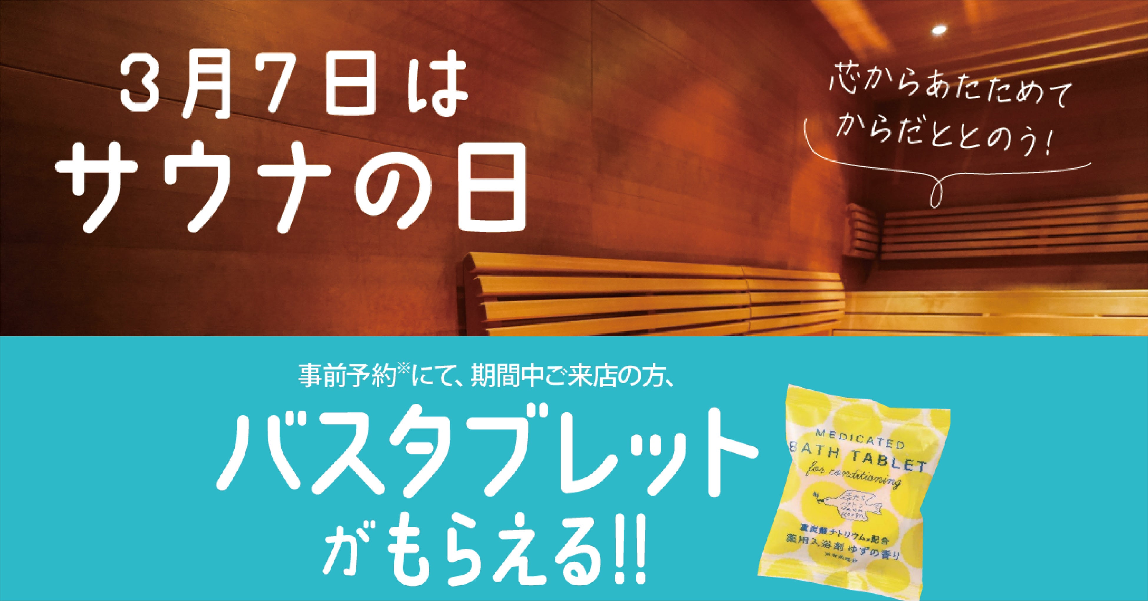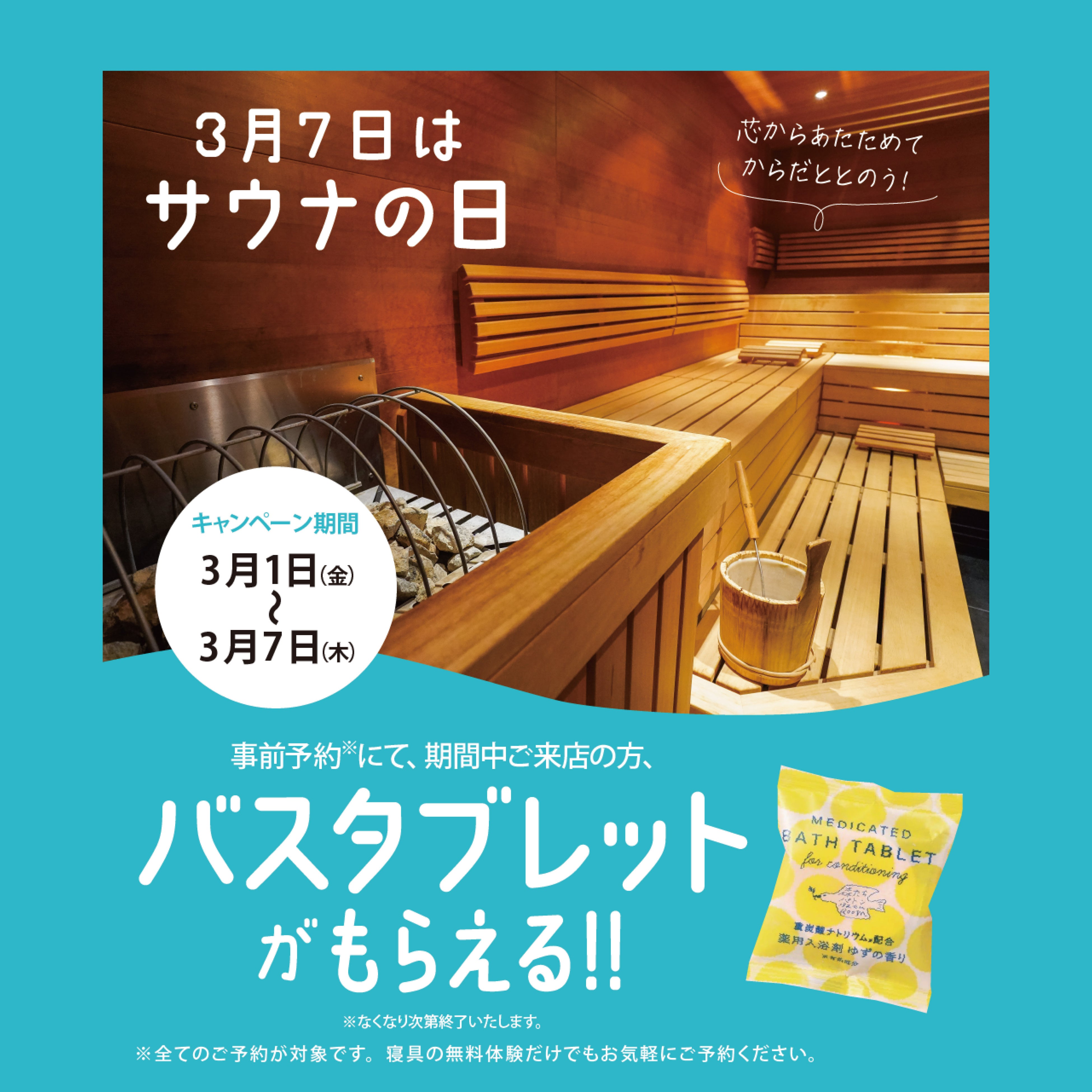 まくらぼでは、「サウナの日」に合わせて、カラダを芯から温めていただくきっかけになればと「サウナの日キャンペーン」を実施いたします。すぐにサウナを活用するのは難しい…という方も、ご予約の上、キャンペーン期間中に来店いただいた方全員に、重炭酸バスタブレットをプレゼントいたしますので、是非この機会をご活用ください。